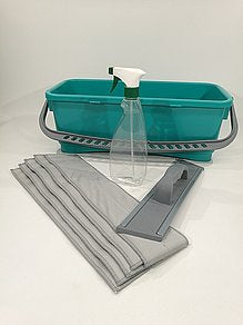 Utstyr som er med i liten komplett pakke: 1 stk Liten vindus bøtte 10 L grønn. 5 stk Glassmopp 40 cm. 1 stk Glassmopperamme 40 cm og spray flaske..